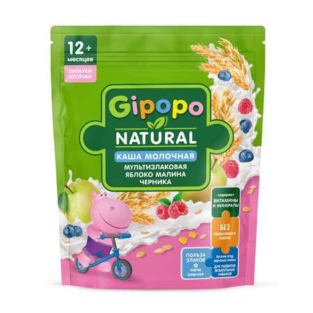 Каша детская молочная фруктовая мультизлаковая GIPOPO с кусочками малины, хлопьями черники и зерновыми хлопьями разработана специально для малышей с 12 месяцев.