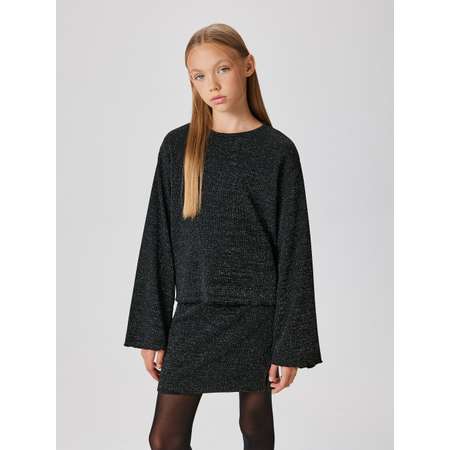 Детский лонгслив с расклешенными рукавами для девочки изготовлен из трикотажa в рубчик, дополненного сверкающим люрексом. Лонгслив посадки comfort предполагает свободный крой, приспущенную линию плеча, а также увеличенные объем и длину рукава. Всё это обеспечивает комфортную посадку на разные типы фигуры и дарит свободу движений. Длинные расклешенные к низу рукава придают образу акцент и делают модель подходящей для холодного времени года. Низ изделия и рукавов, обработанный микрооверлоком, что также придает интересный акцент в виде волнообразного среза. Блестящая блузка для девочки-подростка составят множество праздничных аутфитов. Стилизуйте модель с брюками из того же материала (20210160484) или же с юбкой (20210180258), чтобы составить стильный лук для фотосессии, школьного праздника, дискотеки или семейного торжества.