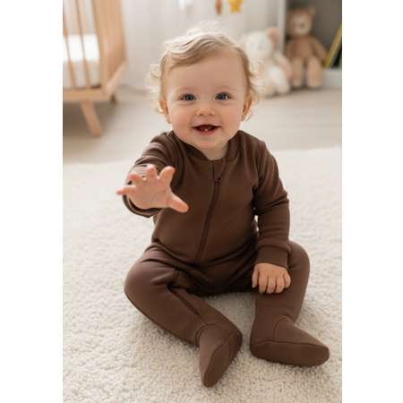 Молния начинается от тыльной стороны стопы. Сверху молния закрыта защитной планкой, чтобы не травмировать кожу ребенка. Ножки закрытые во всех размерах. Манжетки рукавов на резинке. Швы внутренние.