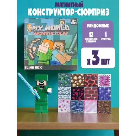 Магнитный конструктор из блоков в стиле Майнкрафт перенесет вас в мир любимой игры. Набор состоит из 3-х коробочек, в каждой из которых 12 рандомных блоков и 1 случайная фигурка. Что именно попадется в наборе - сюрприз. Соберите всю коллекцию, создавая большие постройки. Кубики имеют размер 2х2 см, внутри находится мощный магнит, который надежно скрепляет блоки между собой. Создавай собственные блоковые вселенные с магнитными кубиками: домики, шахты, фермы и крепости — всё собирается быстро и надёжно.