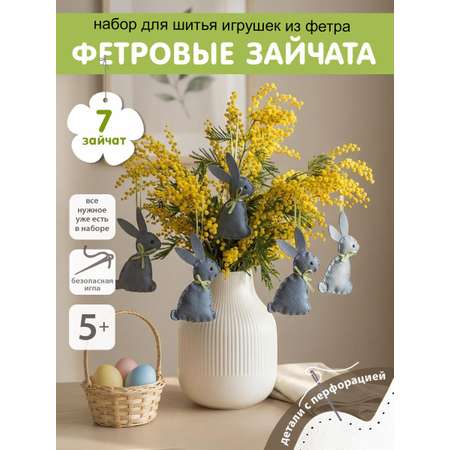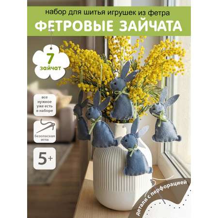Набор для шитья игрушки из фетра HappyLine подойдёт как новичкам, так и маленьким мастерам в этом виде творчества и рукоделия. С ним можно создать целых 7 фигурок пасхальных зайчат! В наборе уже есть всё необходимое для детского шитья: фетровые заготовки для 7 зайцев с перфорацией, безопасная игла, наполнитель для 7 фигурок, атласные ленточки, подробная инструкция, глазки для придания живости вашим поделкам и нитки мулине. Каждый зайка легко сшивается серыми нитками по перфорации, выполненной по внешнему краю.
