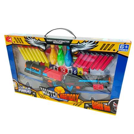 Комплектация: пистолет - 2 штуки, мягкие пули 14шт., мишени-кегли 3шт., защитные очки.