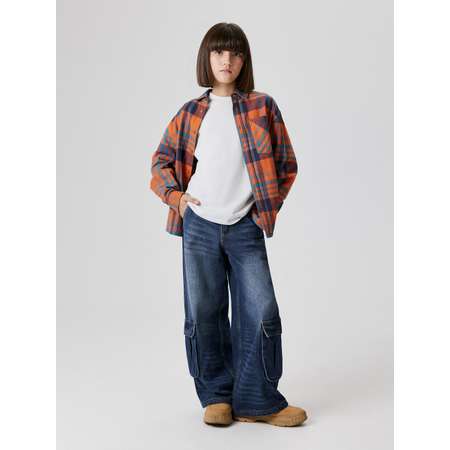 Детские широкие джинсы карго для девочек выполнены из плотного хлопкового денима с трендовым эффектом стирки. Синие джинсы с высокой посадкой легко комбинируются с укороченными лонгсливами и свитерами. Пояс с внутренней эластичной лентой для регулировки объема позволяет подогнать модель под индивидуальные параметры ребенка. Нашитые вдоль пояса шлевки позволяют подчеркнуть образ с помощью ремня. Расположенная спереди застежка-молния и пуговица обеспечивают легкое и быстрое одевание. Модель с шестью карманами: двумя передними, двумя задними и двумя акцентными накладными с клапанами, нашитыми на уровне колен. В качестве дополнительного акцента пояс и низ изделия украшены декоративными строчками. Декоративные потертости и эффект стирки делают джинсы модными и запоминающимися.