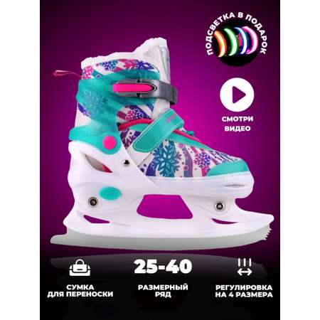 Коньки раздвижные ледовые С ПОДСВЕТКОЙ Ботинок: морозостойкий пластик, искусственная кожа. Язык: искусственная кожа, синтетический трикотаж с поролоном. Подкладка: искуственный мех. Стелька: EVA. Лезвие: универсальное из нержавеющей стали. Фиксация: шнуровка, клипса с фиксатором, "липучка". Раздвижной механизм: кнопочный фиксатор (раздвигаются на 4 размера). Упаковка: сумка. Ледовые раздвижные детские коньки с мехом SPORT COLLECTION–это идеальный выбор для активных и любящих кататься на льду детей! Эта модель сочетает в себе комфорт, функциональность и стильное исполнение. Они подойдут как для начинающих, так и для опытных маленьких фигуристов и хоккеистов. Предназначены специально для детей и подростков и обладают рядом преимуществ. Благодаря своей раздвижной конструкции, они легко регулируются по размеру–на 4 размера! Это удобно, так как ваш ребенок сможет использовать их в течение многих лет. Для удобства и безопасности обеспечивают надежную фиксацию голеностопа и ноги, придают дополнительную уверенность и стабильность во время катания. Поставляются в комплекте с удобной сумкой для переноски и хранения. Сумка не только защитит ваши пластиковые коньки от повреждений, но и позволит вам удобно брать их с собой на каток. Корпус ботинка выполнен из ударопрочного пластика, что придает им дополнительную прочность и долговечность. Фиксируются с помощью шнурков, ремешка липучки и ремешка клипсы на голеностопе. Утепленная меховая подкладка обеспечивает мягкость и тепло в холодные дни. Благодаря заводской заточке, они готовы к использованию сразу после покупки, не требуя дополнительного времени на подготовку. Качественные ледовые лезвия из нержавеющей стали обеспечивают хорошее скольжение и маневренность. Представляют идеальный выбор для девочек и мальчиков, которые хотят наслаждаться прогулками на льду, научится фигурному катанию или играть в хоккей. Их можно использовать как прогулочные, в спортивных зимних мероприятиях, для катания на льду и даже для ледовых фитнес тренировок. В ассортименте так же имеется дополнительная экипировка – шлем, защита рук и ног, а так же белые женские фигурные и мужские взрослые хоккейные коньки. Для летнего сезона роликовые коньки. Эксклюзивная упаковка делает их отличным подарком для детей.