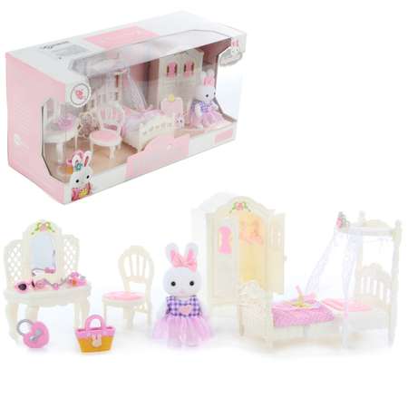 Кукла зайчик с набором мебели станет хорошим подарком для каждого ребенка. Большое количество предметов, компактные размеры, красивый дизайн. Разнообразит сюжетно-ролевые игры. В комплект входят стул, игрушка шкаф с открывающимися дверками, 2 вешалки, игрушка туалетный столик с зеркалом, 2 сумочки, ожерелье, зайчик, браслет, часы, корона, очки, кровать. Аксессуары можно одеть на зайчика.