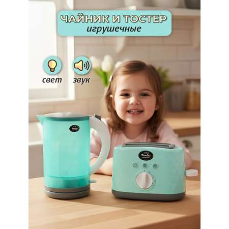 В комплект детского игрового набора входят чайник, тостер и 2 тоста.
