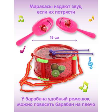 Маракасы издают звук, если их потрясти, у барабана удобный ремешок, можно повесить барабан на плечо. Игрушка развивает артистические способности, воображение, слуховое и зрительное восприятие, координацию движений, мелкую моторику рук, знакомит с миром музыкальных инструментов.
