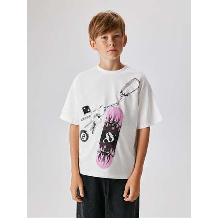 Детская футболка со скейтбордом для мальчика – это прекрасный выбор на каждый день. Модель выполнена из легкой и дышащей кулирной глади, что делает ношение комфортным в течение дня. Футболка COMFORT fit отличается свободным кроем, который дарит легкость движений для активных детей. Приспущенная линия плеча, увеличенные объем и длина рукава добавляют луку нотку расслабленности и непринужденности. Округлая горловина не мешает при одевании. Спереди расположен принт в виде ключей со скейтбордом, что придает изделию оригинальный и интересный вид. Принт на водной основе не выцветает и не трескается при стирках, а значит, будет радовать своими яркими красками долгое время. Комбинируйте белую футболку с брюками для создания стильного повседневного аутфита.