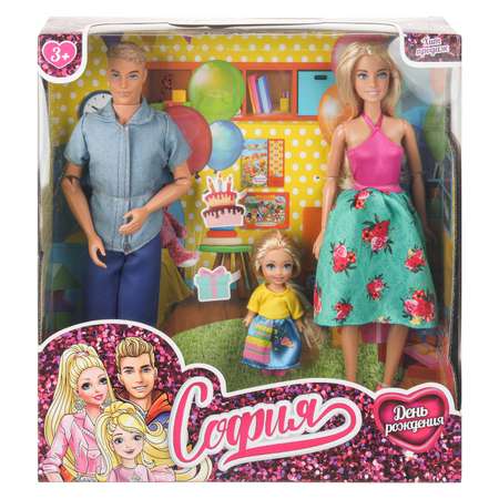 Для семейного праздника София подобрала красивое платье с розовым лифом и зелёной юбкой с цветочным принтом. Алекс предпочёл голубую рубашку с коротким рукавом и синие брюки. А их дочка одета в яркое платье с тематическим принтом на юбке. Одежду легко снять и надеть. С такими модными куклами девочке будет интересно и весело играть: благодаря тому, что руки и ноги кукол София и Алекс подвижны, им можно придать любое положение. У Софии и её малышки длинные красивые волосы, которые хозяйка кукол сможет заплетать в разные причёски. Детально проработанный дизайн игрушек вдохновит девочку на новые игровые сюжеты.
