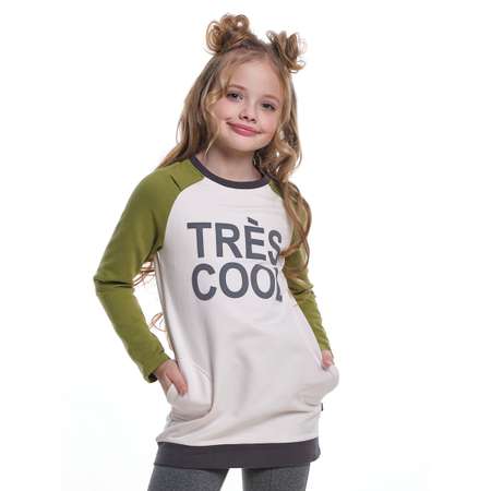 Свитшот для девочки (хаки). Выполнена из гребенной пряжи. Двунитковый хлопковый футер с двухсторонним начесом, 5% лайкры. Крой реглан, свободный комфортный, округлая горловина с контрастной окантовкой, длинный рукав без манжет. Низ – пришивная полоса из контрастной ткани. Декорирована принтом. Подходит как универсальный элемент одежды для дома, дошкольных мероприятий, прогулок, спортивных и игровых площадок.