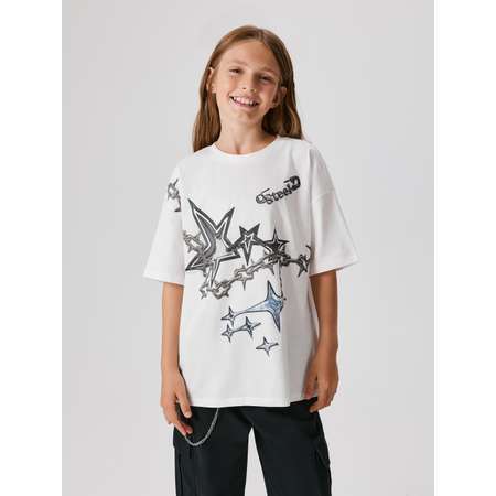 Детская футболка оверсайз с принтом станет стильным дополнением к гардеробу мальчиков или девочек. Модель COMFORT fit отличается свободным кроем, что позволяет создавать ультрамодные образы. Спущенная линия плеча, увеличенные объем и длина рукава добавляют аутфиту нотку расслабленности и непринужденности. Округлая горловина не мешает при одевании. Спереди расположен принт в виде цепочки с подвесками и надпись "STEET" [англ. - "Улица"], что придает образу оригинальный и стильный акцент. Стилизуйте белую футболку с брюками для создания модного лука на встречи с друзьями. Изделие также прекрасно сочетается с рубашками.