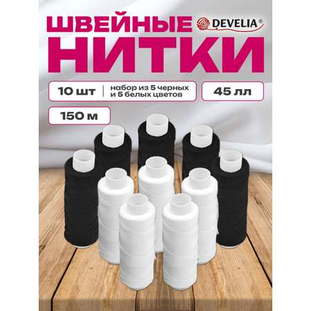 Нитки для шитья Develia армированные 45ЛЛ 150 м швейный набор 10 штук белые черные