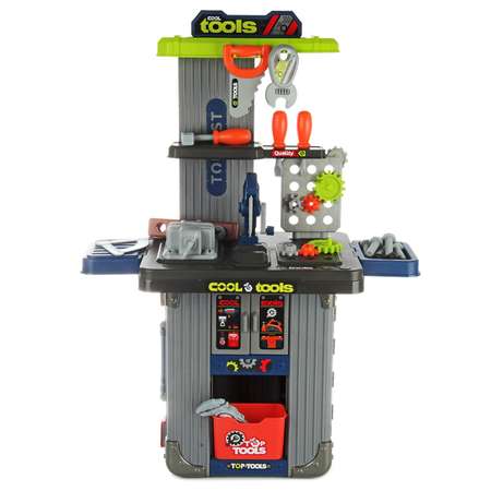 Игрушка для мальчика 3 в 1, верстак, чемоданчик с рабочей панелью и чемоданчик для хранения предметов, множество аксессуаров и игрушечных инструментов в комплекте. Рабочая панель, в которую можно вкручивать детали, подвижные элементы, крючки, на которые можно повесить инструменты, удобная система хранения чемоданчик. Подвижная губка тисков, циркулярная пила с вращающимся диском. Детский верстак для мальчика изготовлен из прочных и безопасных материалов в качественном исполнении.