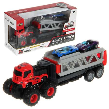 Игровой набор автовоз с фрикционным механизмом и металлическими гоночными машинками. У автовоза раскладывается платформа трасса, образуя длинный автотрек. Весь игрушечный транспорт катается вперёд и назад, на платформе автовоза пружинистый рычажок катапульта. Детский трек для машинок изготовлен из прочных и долговечных материалов с вниманием к деталям. Оформлен в приятной расцветке.