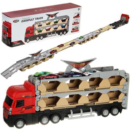 Игровой набор для мальчика большой автотрек с набором гоночных машинок. У автовоза раскладывается платформа трасса, образуя длинный автотрек. Весь игрушечный транспорт катается вперёд и назад, автовоз фрикционный, гоночные автомобили с металлическим корпусом, пружинистый механизм катапульта для игры в гонки, съемная компактная ручка, можно удобно переносить автовоз как чемоданчик. Детский трек для машинок изготовлен из прочных и долговечных материалов с вниманием к деталям. Оформлен в яркой, привлекающей внимание, расцветке.