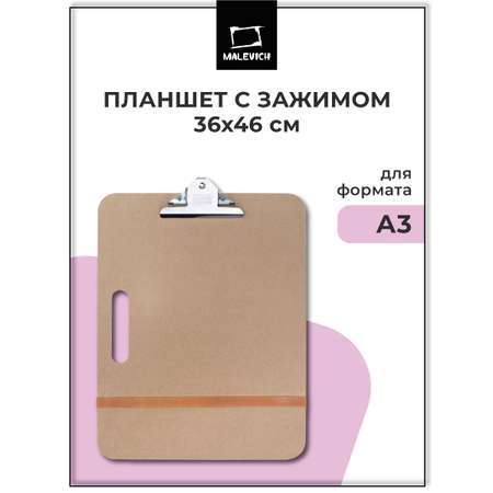Планшет с зажимом формата А3 (клипборд). Изготовлен из экологически чистого материала, МДФ (оргалита), легкий и практичный планшет Малевичъ - настоящая находка для любителей эскизов и выездов на пленэр. Планшет оснащен одним большим зажимом для бумаги и силиконовой резинкой по нижнему краю доски, надежно удерживающими лист бумаги даже при сильном ветре. Небольшая толщина планшета позволяет также закреплять лист необходимым количеством дополнительных зажимов. Гладкая поверхность подходит для работы с самой тонкой бумагой и гарантирует легкое скольжение карандашей, перьев или мелков.