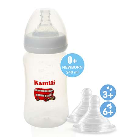 В комплект входит бутылочка с широким горлышком Ramili Baby, соска медленный поток для детей с рождения 0+, дополнительная соска средний поток для детей от 3 месяцев и дополнительная соска быстрый поток для детей от 6 месяцев.