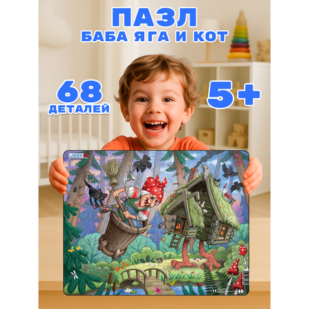 Сказочный пазл от Larsen состоит из 68 элементов.На фоне зеленого леса изображена Баба Яга со своим котом. Ловко управляя помелом, она летит в ступе по своим сказочным делам. Избушка на курьих ножках сопровождает хозяйку. Пазл понравится малышам от пяти лет.