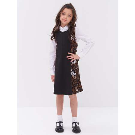 Детское платье-сарафан для девочки. Сарафан длиной миди, фасон А-сулуэт. Платье без рукавов, состоит из клиньев из плотного трикотажа черного цвета и трикотажа с леопардовым принтом. В боковых швах находятся завязки, с помощью которых легко регулировать степень прилегания платья