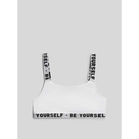 Топ на регулируемых бретелях, для девочек,выполненный из эластичного хлопкового трикотажного полотна белого цвета.Линия пояса изделия имеет жаккардовую тесьму с текстом. Передняя часть изделия на подкладке их х/б полотна.