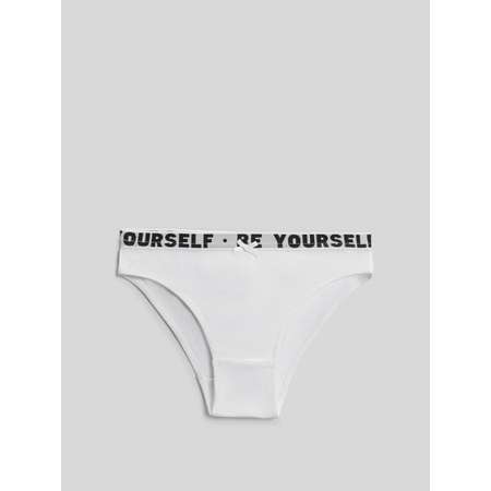 Трусы для девочки классической посадки. Выполненны из эластичного хлопкового трикотажного полотна белого цвета. Линия талии изделия имеет жаккардовую тесьму с текстом. Ластовица выполнена из 100% хлопка.