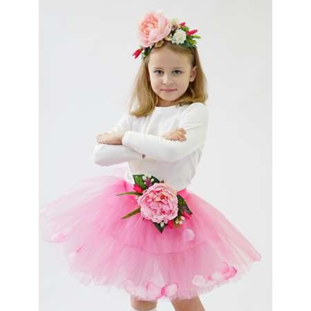 Карнавальный костюм розовый цветок для девочки состоит из 3 предметов: декоративный ободок - венок с розовым пионом, юбка пачка с лепестками цветов внутри, брошь с цветами и листьями.