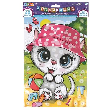 С помощью красочной картонной основы и разноцветных мягких элементов юная художница сможет самостоятельно создать необычную аппликацию с изображением очень забавного котёнка в панаме. Готовую поделку можно подарить близким или использовать для украшения интерьера.