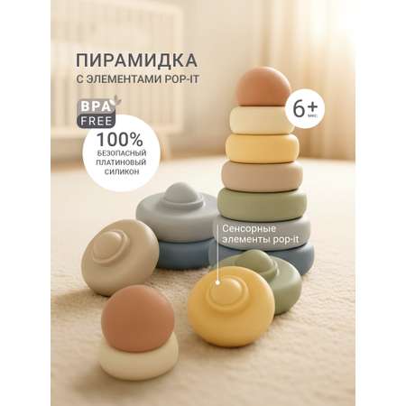 Пирамидка развивает мелкую моторику, логическое мышление и координацию малыша. Мягкая цветовая палитра игрушки гармонично сочетается с интерьером детской.