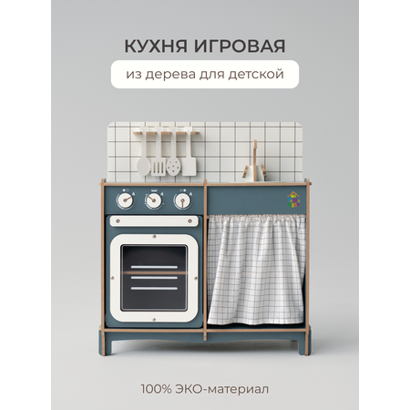 Игровая кухня детская деревянная изготовлена из прочных и безопасных материалов — ЛМДФ и натуральной древесины. Дверцы духовки и шкафчиков открываются, регуляторы крутятся, элементы устойчивы к активной игре.