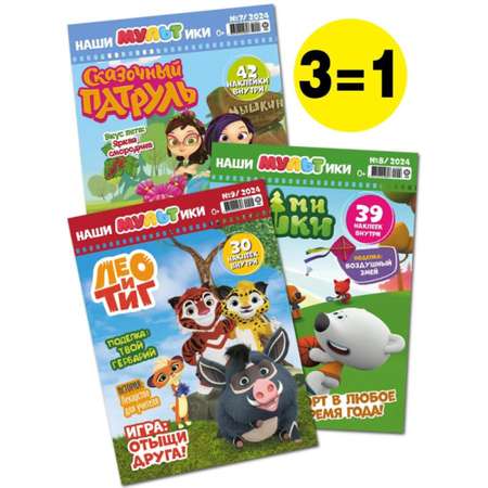 Наши Мультики 3 по цене 1 - это комплект из трех развивающих детских журналов для детей 1,5-6 лет. В комплекте журнал Ниши Мультики №7/2024 (Сказочный патруль), №8/2024 (МиМиМишки) и №9/2024 (Лео и Тиг). Все персонажи телеканала "МУЛЬТ" (Сказочный патруль, Лео и Тиг, МиМиМишки, Деревяшки и другие) в одном журнале! В каждом выпуске один иллюстрированный рассказ (6-8 страниц), интересные задания, головоломки, бродилки, игры и наклейки. Недорогой и качественный подарок для ребёнка, совмещающий игры и чтение в одном комплекте. Журнал с наклейками. Отличный выбор, если Вы хотите приобрести подарки для группы.