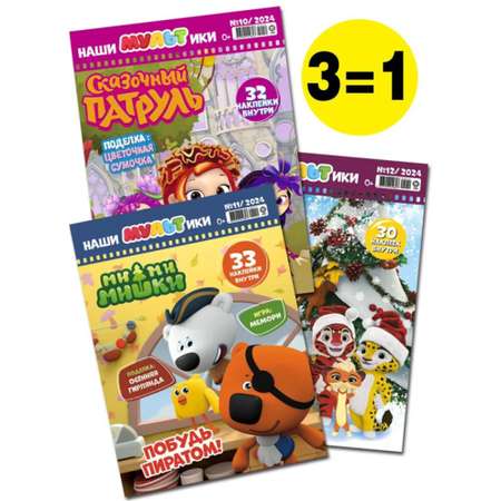 Наши Мультики 3 по цене 1 - это комплект из трех развивающих детских журналов для детей 1,5-6 лет. В комплекте журнал Ниши Мультики №10/2024 (Сказочный патруль) + 32 наклейки + поделка: "Цветочная сумочка", №11/2024 (МиМиМишки) + 33 наклейки + поделка "Осенняя гирлянда" и №12/2024 (Лео и Тиг) + 30 наклеек + поделка "Маска Тигра". Все персонажи телеканала "МУЛЬТ" (Сказочный патруль, Лео и Тиг, МиМиМишки, Деревяшки и другие) в одном журнале! В каждом выпуске один иллюстрированный рассказ (6-8 страниц), интересные задания, головоломки, бродилки, игры и наклейки. Недорогой и качественный подарок для ребёнка, совмещающий игры и чтение в одном комплекте. Журнал с наклейками. Отличный выбор, если Вы хотите приобрести подарки для группы.