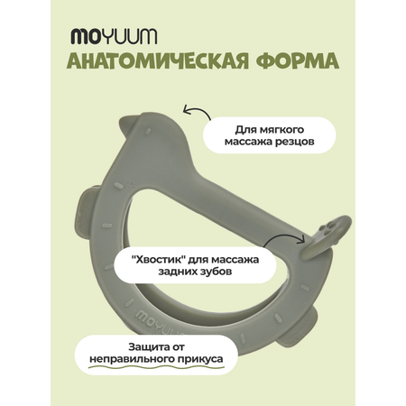 Moyuum – незаменимый помощник в период прорезывания зубов у младенцев. Прорезыватель эффективно устраняет неприятные болезненные ощущения, зуд и дискомфорт. Его выступающие части отлично подходят для мягкого массажа десен. В результате ребенок не сосет пальцы и обучается правильной привычке гигиены полости рта. В то же время милая привлекательная игрушка помогает отвлечь внимание и успокоить малыша, а ее спокойные красивые цвета приятны глазу. Мы разработали прорезыватель специальной эргономичной формы, без каких-либо съемных деталей, что обеспечивает детям полную безопасность. Аксессуар удобно фиксируется на руке и не выпадает из ладошки. Его небольшие размеры и легкий вес оптимальны для маленькой детской кисти. Особый дизайн позволяет чесалке стоять на столе. Жевательная поверхность при этом ни с чем не соприкасается и дольше остается чистой. Изделие изготовлено из премиального платинового силикона, отличающегося стабильностью при разных температурах от -50 до 200°С, поэтому его можно охлаждать и подмораживать. Этот качественный, абсолютно безопасный материал не имеет постороннего запаха и привкуса. Наш силиконовый прорезыватель не деформируется, от него невозможно откусить кусочек, его легко мыть и стерилизовать любым способом. Выдерживает обработку в пмм и свч, стерилизацию паром и кипячением.