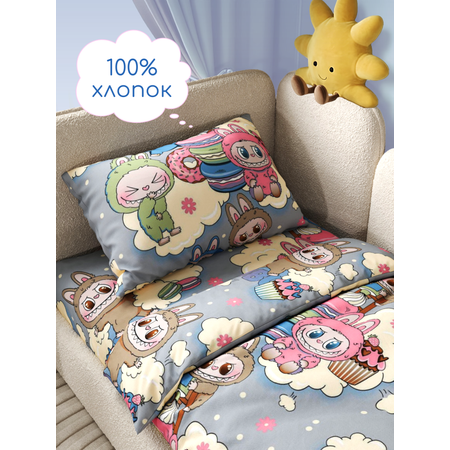 Детское Постельное белье хлопок от ивановского бренда Павлинка Лабубу из коллекции для детей юниор украсит интерьер детской комнаты и идеально подойдёт для детской кроватки с матрасом 160х80 см.