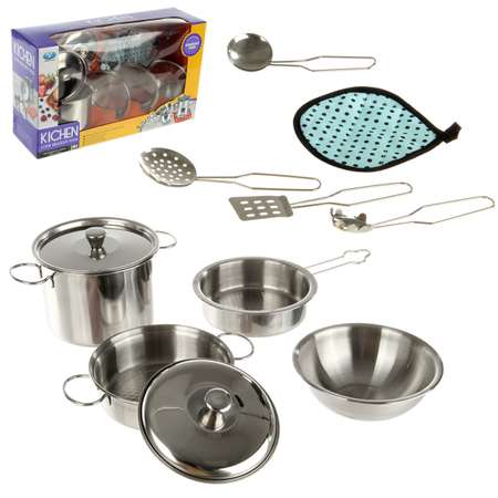 Замечательный набор посуды для тематических игр. Все крышки снимаются. Набор отлично развивает мелкую моторику рук, координацию движений, воображение, помогает придумать множество увлекательных сюжетно-ролевых игр. В комплект входят 2 кастрюли, сковорода, 2 крышки, миска, половник, лопатка, шумовка, ложка для спагетти, прихватка.