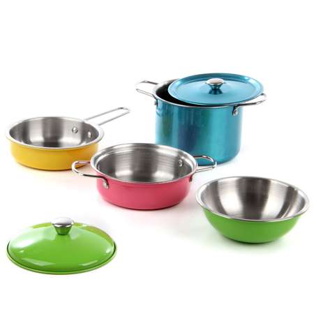 Игрушечный набор металлической посуды. Набор оформлен в красивой расцветке, реалистичном дизайне. Большое количество предметов, качественное исполнение, прочные и долговечные материалы, набор прослужит много лет.