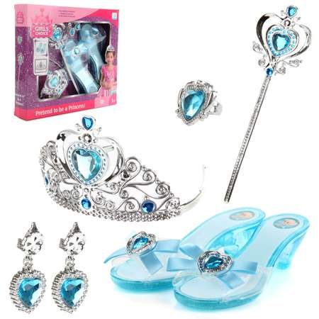 Потрясающий набор для маленькой принцессы. В комплект входят волшебная палочка, корона-ободок, серьги-клипсы, кольцо и туфельки. Ободок короны растягивается, подойдет практически для любого размера головы.