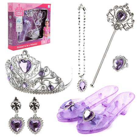 Потрясающий набор для маленькой принцессы. В комплект входят волшебная палочка, корона-ободок, ожерелье, серьги-клипсы, кольцо и туфельки. Ожерелье на застежке, ободок короны растягивается, подойдет практически для любого размера головы. С таким набором ребенок придумает множество увлекательных сюжетно-ролевых игр, примерит разные образы, будет развивать воображение, мелкую моторику рук и координацию движений.