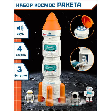 В комплекте игрушка космический корабль, 3 космонавта, 9 карточек.