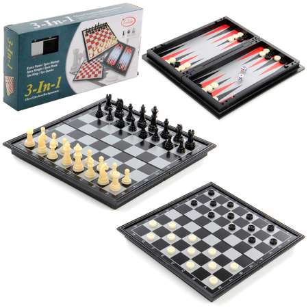 Набор для игры в шашки, шахматы и нарды. Магнитные шахматы разнообразят сюжетно-ролевые игры. Набор обладает компактными размерами, удобно брать с собой в дорогу. В комплект входят доска, набор черных и белых шахмат, 2 кубика, набор шашек.