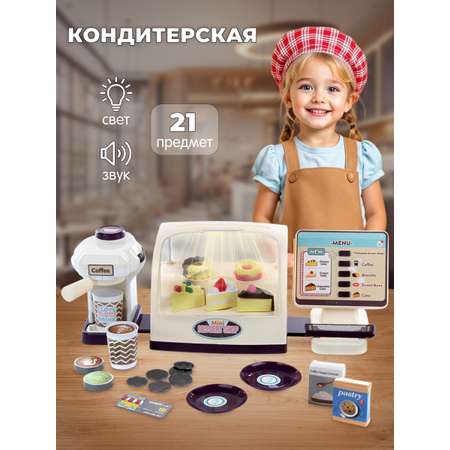 Стойка, детский кассовый аппарат, кофемашина, 3 куска торта, 2 пончика, 2 тарелки, монеты, кредитная карта, кассеты для кофе, 2 коробки.