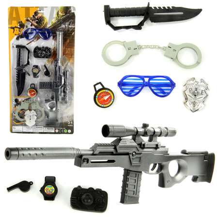 Набор оружия выполнен в реалистичном дизайне. В комплект входит винтовка, свисток, часы, компас, значок, наручники, очки, фотоаппарат, нож.