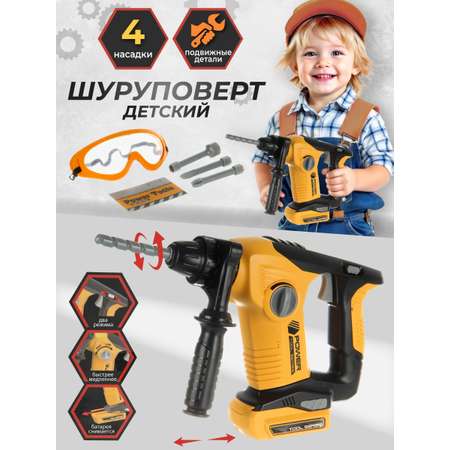 Набор инструментов в реалистичном дизайне. Дрель с вращением патрона по часовой и против часовой стрелки, 2 скорости вращения, более быстрая и более медленная, съемный аккумулятор, красивая подсветка, сменные насадки, рукоять удобная для хвата, очки на резинке. Прочные и долговечные материалы, качественное исполнение, внимание к деталям, привлекательная расцветка. Ребёнок будет учиться обращаться с домашним инструментом.