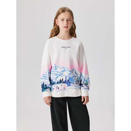 Детский свитшот с градиентным принтом гор выполнен из принтованного футера с мягким начесом на изнанке. Модель COMFORT fit отличается свободным кроем для более комфортного ношения. В свитшоте приспущена линия плеча, а также увеличен объем рукава. Такой крой создает модный силуэт и позволяет составлять многослойные сложные образы в демисезон. Удобная округлая горловина, низ изделия и рукавов выполнены из мягкого эластичного риба, который обеспечивает приятное прилегание к телу и лучшее сохранение тепла. Модель украшена принтом с изображением заснеженных гор надписью: "NORTHERN WIND" [англ. - "Северный ветер"]. Градиентный принт добавляет образу стильный и эффектный штрих. Свитшот представлен в двух вариантах: в розовом и молочном. Дополните модель с брюками (20240460019), чтобы создать стильный и комфортный повседневный образ.