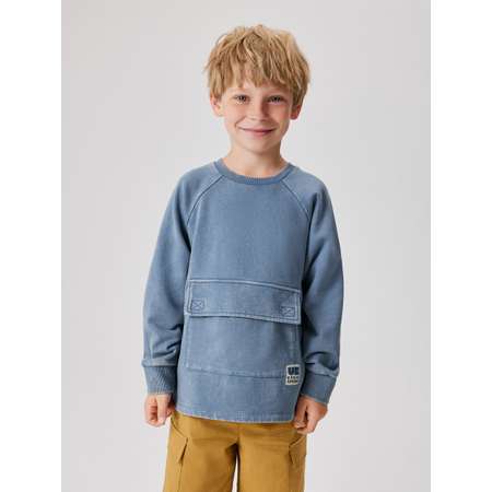 Детский голубой свитшот с накладным карманом — стильная модель, призванная разнообразить гардероб мальчика. Толстовка выполнена из хлопкового плотного трикотажа с петельной изнанкой (без начеса), который комфортно носится на протяжении всего дня. Модель посадки comfort предполагает свободный крой, приспущенную линию плеча, а также увеличенные объем и длину рукава. Всё это позволяет с легкостью составлять многослойные образы в холодное время года, а также дарит большую свободу движений. Рукав реглан обеспечивает удобную посадку на разную ширину плеч. Удобная округлая горловина и манжеты выполнены из эластичного рибового полотна, обеспечивающего плотное прилегание к телу и сохранение формы изделия. Спереди располагается большой накладной карман с клапаном на липучке; на кармане расположена декоративная нашивка с надписью "URBAN EXPLORER" [англ. - "Городской исследователь"]. Стилизуйте свитшот с рубашкой и брюками карго (20120160431) для создания модного повседневного образа.