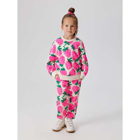 Детские брюки-джоггеры с клубничками для девочки изготовлены из футера с небольшим мягким начесом, который добавляет тепло и комфорт в ношение. Широкий эластичный пояс обеспечивает комфортную посадку на разные типы фигур, а шнурок для дополнительной регулировки позволяет подогнать изделие по полноте под индивидуальные параметры ребенка. Практичности добавляют вместительные боковые карманы. Манжеты из риба по низу штинин обеспечивают плотное прилегание к телу и лучшее сохранение тепла. Всю поверхность брюк украшает яркий принт с изображением клубничек. Рисунок на водной основе не выцветает и не трескается при стирках, а значит, будет радовать своими яркими красками долгое время. Модель представлена в двух вариантах: молочном с клубничками и розовом с принтом апельсинок. Дополните брюки комплектным свитшотом (20220170166), чтобы собрать теплый костюм для девочки.