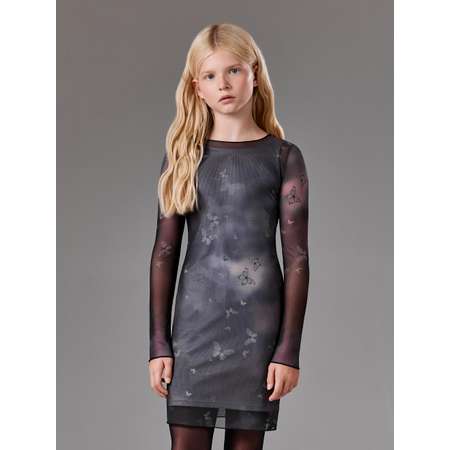 Платье-сетка с длинным рукавом для девочки — это отличный айтем для создания утонченных образов, которые будут уместны и в будни, и в праздники, благодаря стильному дизайну. Нарядное детское платье для девочки выполнено из принтованной сетки с принтом бабочек; нижний слой выполнен из мягкой трикотажной подкладки, которая делает ношение комфортным, а само платье — непрозрачным. Платье-сетка приталенного кроя, длиной до колена подойдет для создания образа на разные случаи. Изделие украшено изящным принтом в виде бабочек, а градиентные цвета создают эффект загадочной дымки. Удобная округлая горловина не мешает при одевании. Модель позволит создавать запоминающиеся и изящные образы с темными колготками и удобной обувью на плоской подошве. Модель выполнена в двух вариантах: с черным принтом и с фиолетовым принтом.