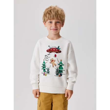 Детский белый свитшот с новогодним принтом для мальчика выполнен из флиса с мягким начесом на изнаночной стороне. Модель посадки comfort предполагает свободный крой, приспущенную линию плеча, а также увеличенные объем и длину рукава. Всё это обеспечивает легкость движений и возможность создавать многослойные сложные образы в демисезон. Удобная округлая горловина, манжеты и низ изделия выполнены из рибового полотна для лучшего прилегания к телу и сохранения тепла. Свитшот украшен принтом в новогодней тематике, который отлично разбавит общий аутфит, добавляя ему сильный штрих. Стилизуйте модель с брюками карго (20120160431), чтобы создать стильный, теплый и уютный образ на каждый день зимних каникул.