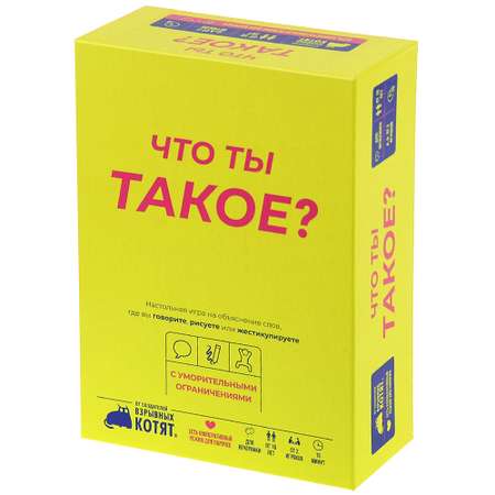 "Что ты такое?" могла стать очередной игрой на объяснение слов разными способами, при взгляде на которую в голове появлялся бы вопрос, украшающий коробку. Но она не стала! А всё благодаря своей изюминке – забавным ограничениям, превращающим игровой процесс в театр абсурда и нескончаемой уморы.