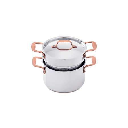 Комплект включает кастрюлю, вставку-дуршлаг и крышку.