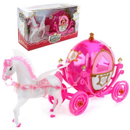 Замечательный набор для увлекательных сюжетно-ролевых игр. В комплект входят лошадка, крылья и карета. У лошадки отстегиваются крылышки, снимаются седло и уздечка. Фигурка лошадки жесткая. Лошадку можно запрячь в карету. Карета катается вперед-назад. Фонари кареты подсвечиваются. У кареты открываются дверки.